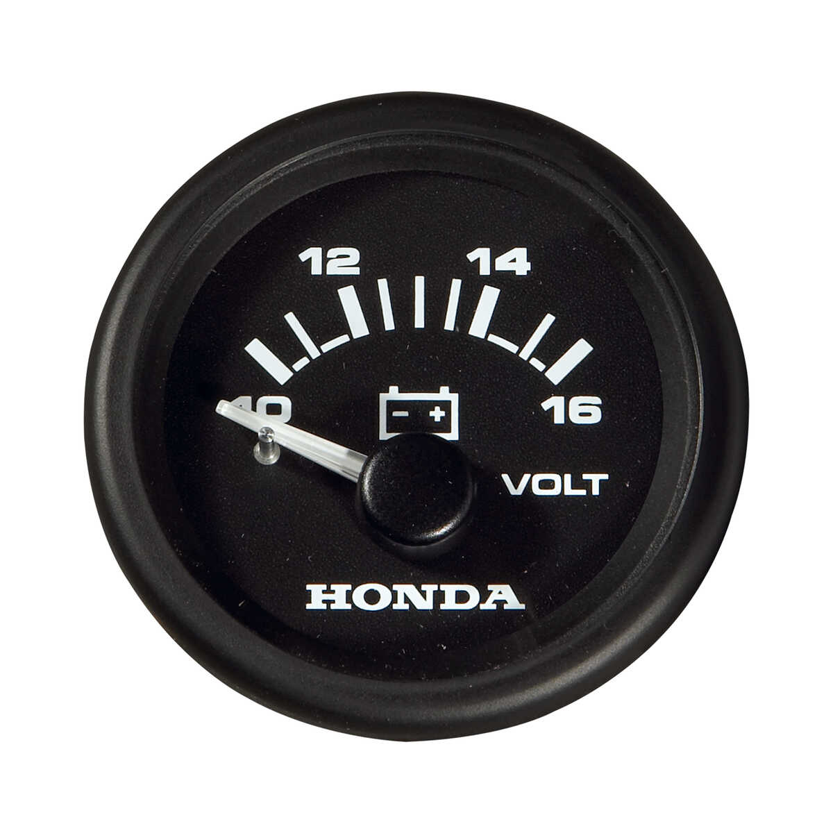 Honda voltmeter met zwarte rand en zwarte wijzerplaat.